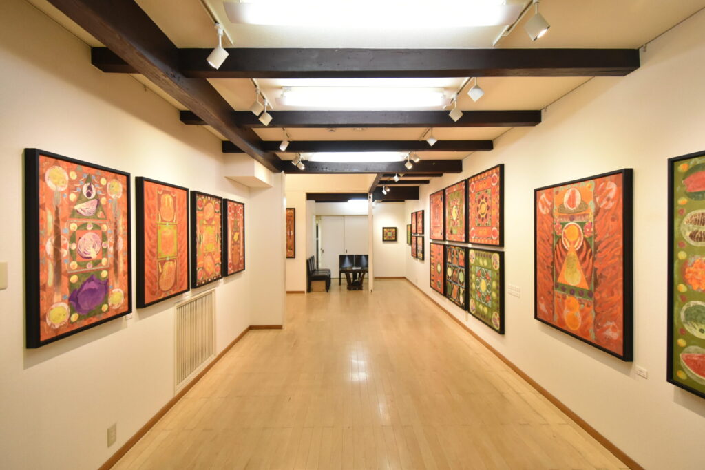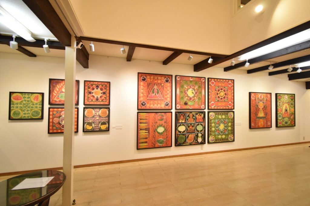 伊根の舟屋、古墳や社のある風景、巨樹シリーズから、再び野菜や果物を素材に《お経の文字と野菜》《印仏と野菜》《曼荼羅と野菜》として想念しながら、野菜や果物を構成して楽しく画面の中で遊ばせています。時には、地域の市場に通い土の中で曲がりくねった野菜を探しています。