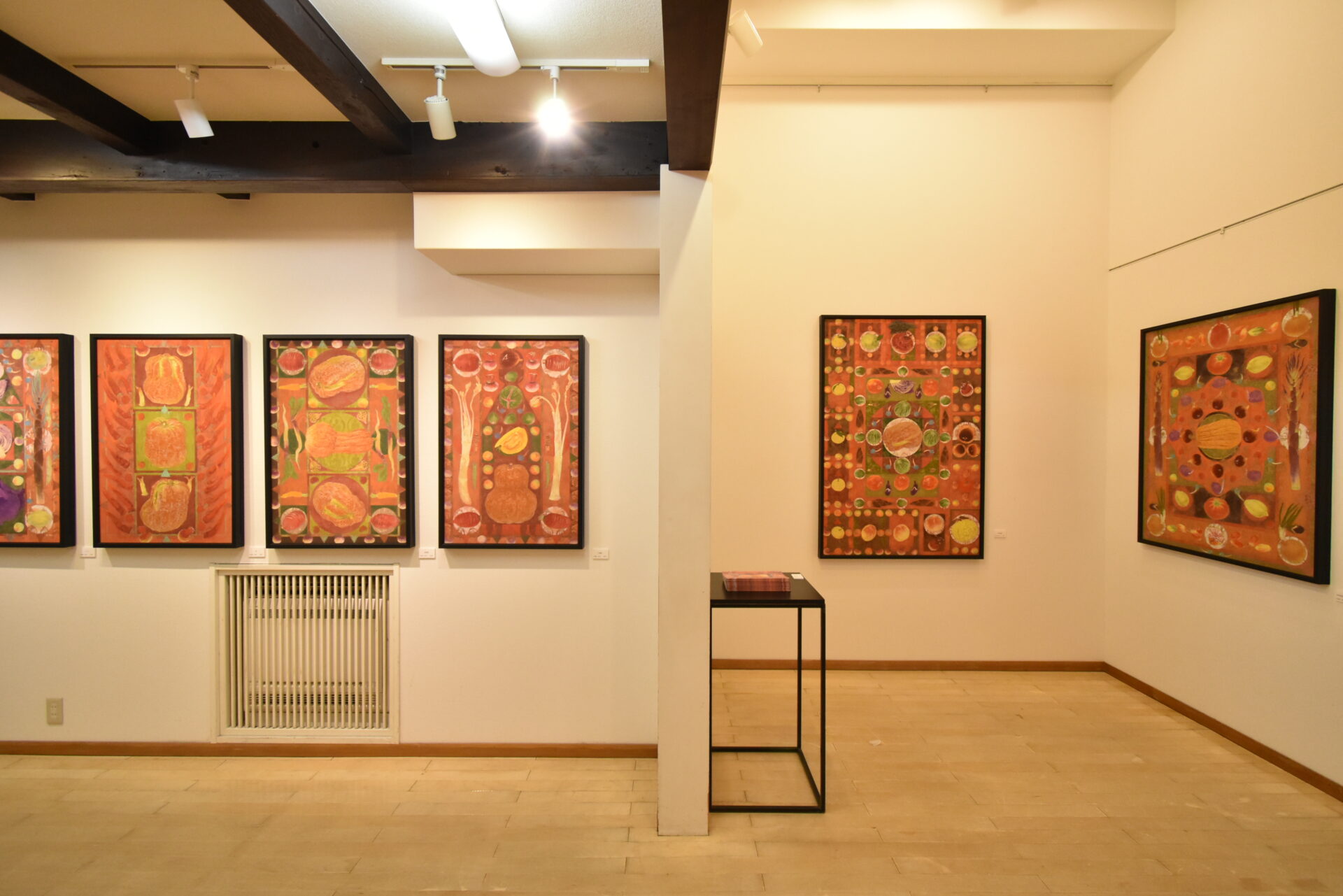 伊根の舟屋、古墳や社のある風景、巨樹シリーズから、再び野菜や果物を素材に《お経の文字と野菜》《印仏と野菜》《曼荼羅と野菜》として想念しながら、野菜や果物を構成して楽しく画面の中で遊ばせています。時には、地域の市場に通い土の中で曲がりくねった野菜を探しています。