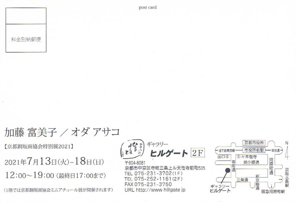この展覧会は終了しました 版画 京都銅版画協会 特別展示 オダアサコ・加藤富美子展 基本情報 会期2021年07月13日(火) 〜 2021年07月18日(日) 会場2階 時間12:00~19:00(最終日は17:00まで)