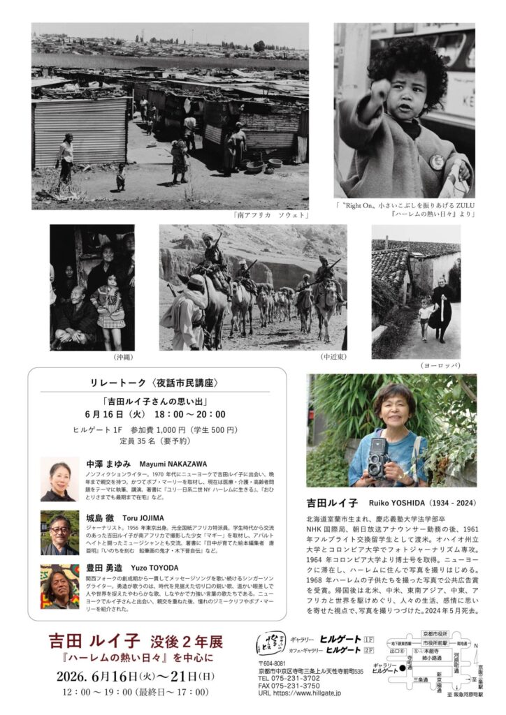 ’60~’80年代、女性フォトジャーナリストの草分けとしてNYのハーレムやアパルトヘイトに揺れる南アフリカ等、世界の熱い現場を撮り続けられた吉田ルイ子さん。NYで出会って以来、晩年の闘病生活も支え続けられた中澤さん、特派員として海外でも行動を共にされた城島さん、NYで憧れのボブ・マーリーを紹介してもらったという豊田さん。三人がルイ子さんとの思い出とともに、貴重な時代の証言をして下さいます。