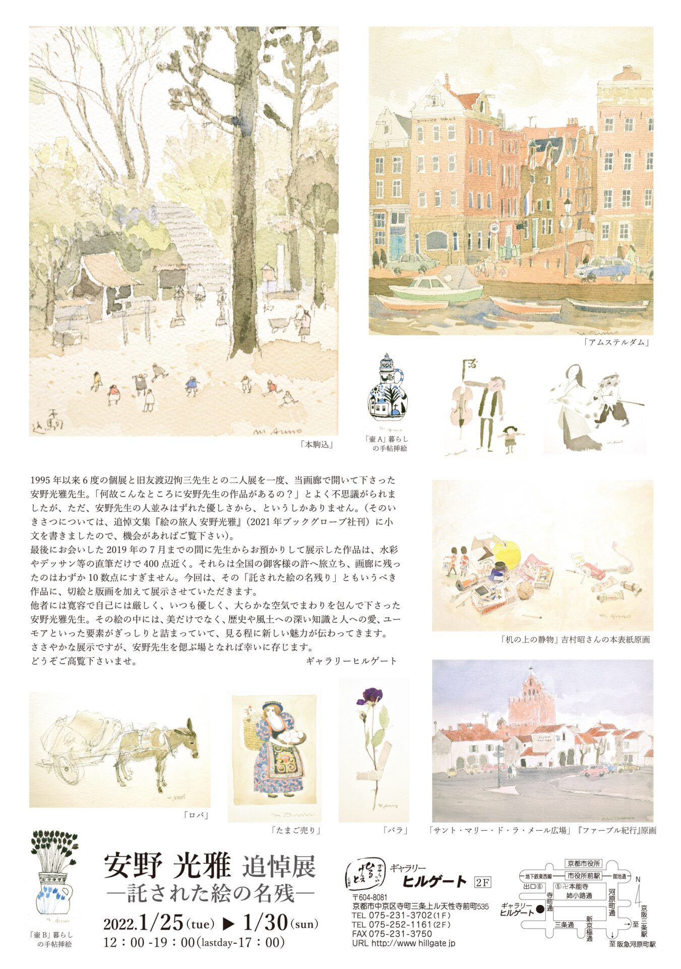 最後にお会いした2019年の7月までの間に先生からお預かりして展示した作品は、水彩やデッサン等の直筆だけで400点近く。それらは全国の御客様の許へ旅立ち、画廊に残ったのはわずか10数点にすぎません。今回は、その「託された絵の名残り」ともいうべき作品に、切絵と版画を加えて展示させていただきます。