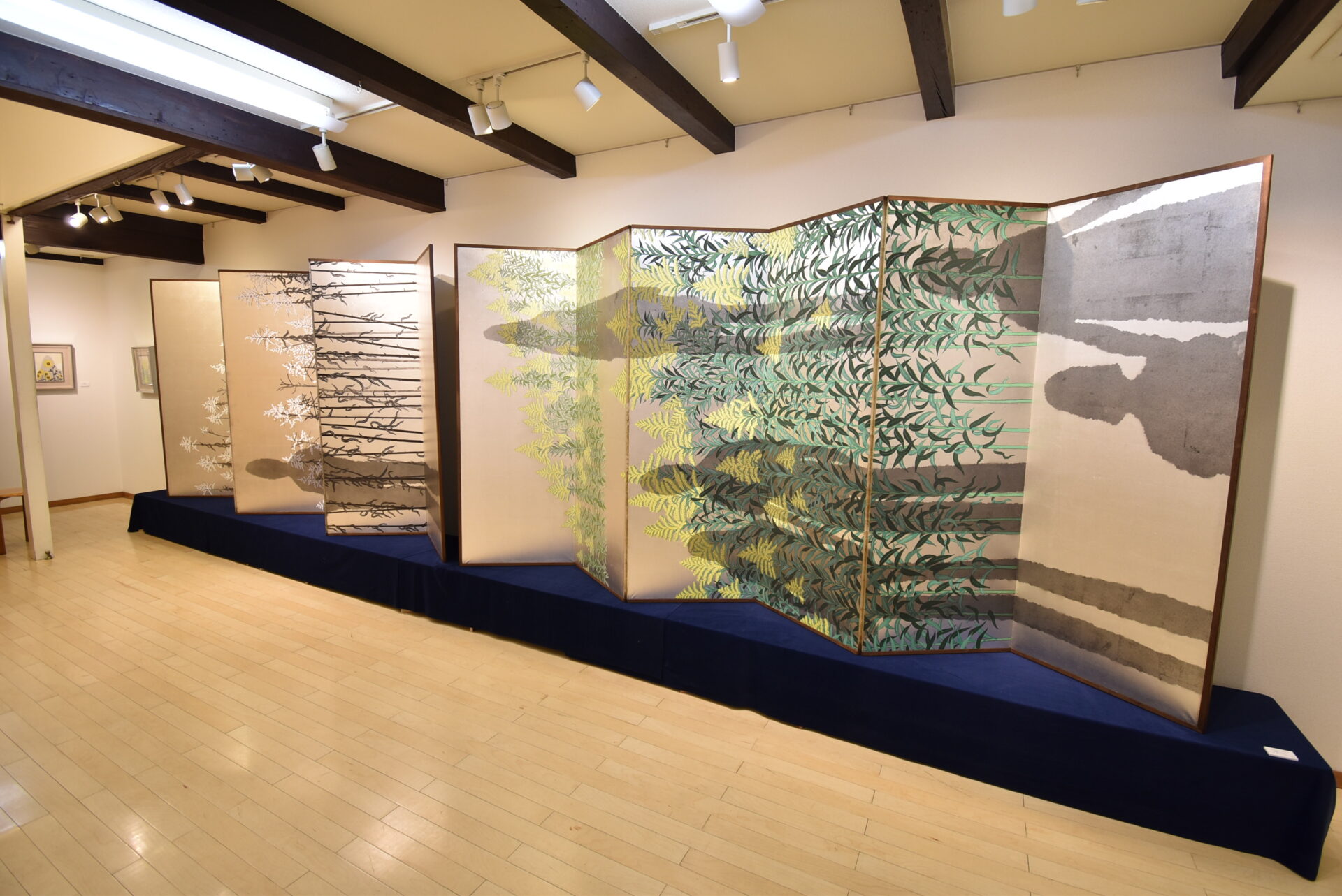 新作の屏風に描かれた草花が強風になびいて見えるのか?伸びる影が飛び去るように見えるのか?はたまた物凄いスピードで自分自身が移動しているように見えるのか?