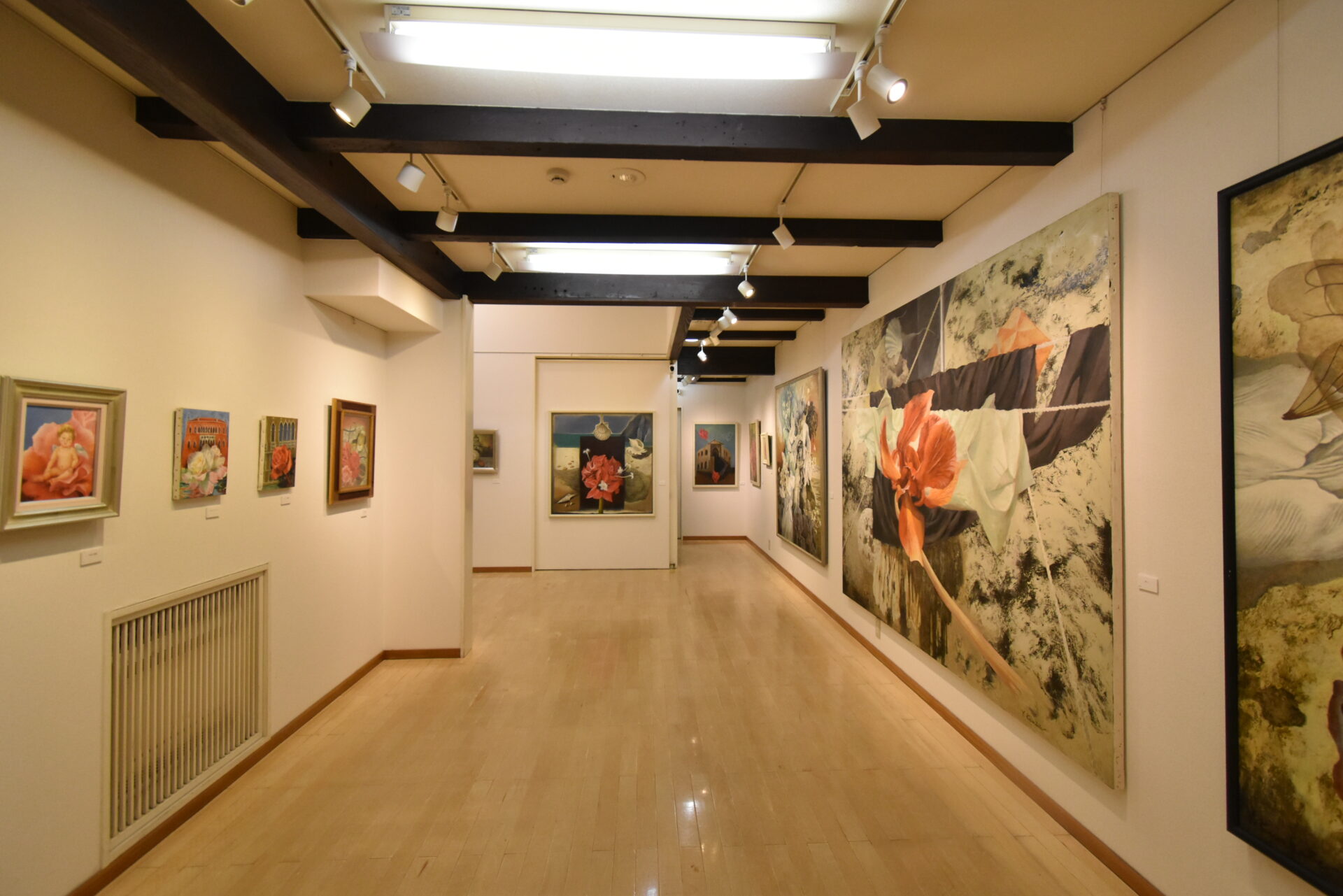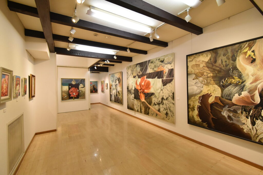 日下部さんは1954年に美大を卒業後、家庭に入られ、約30年のブランクを経て、1983年52歳の時に、第51回独立展に初出品・初入選をされました。その後は、独立展はもとより、女流画家協会展や個展、グループ展などを発表の場とし、それまでのブランクを感じさせない堰を切ったような勢いで旺盛な制作活動を展開されました。生前そのことを「上昇するロンド(輪舞)のような展開を続けているという実感」と語っておられました。画家デビューは遅くとも、長いブランクを経てもなおの初志貫徹はお見事、相当の強い意志がなければ叶わぬことです。自らの意志に正直に前に進むことができる強い女性だったと思います。日下部さんの作品には、全面を覆うほどの大きな花が、おおらかな力強いフォルムで宙を舞っています。フォルムも色彩も強いが決して華美に流されず、やさしくて上品、やわらかい質感はご本人そのままです。