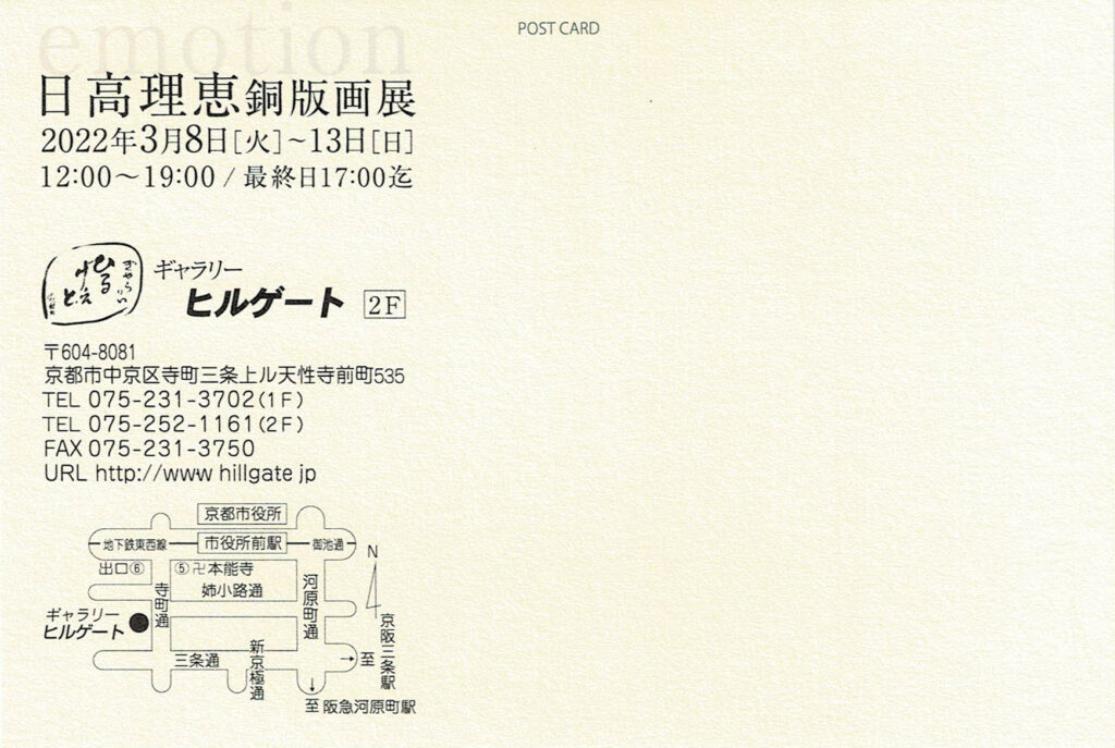 この展覧会は終了しました 版画 日高 理恵 銅版画展 emotion 基本情報 会期2022年03月08日(火) 〜 2022年03月13日(日) 会場2階 時間12:00~19:00(最終日~17:00)