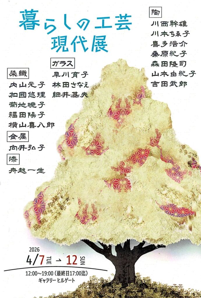 開幕まで 残り42日 暮らしの工芸 現代展 基本情報 会期2026年04月07日(火) 〜 2026年04月12日(日) 会場1階, 2階 時間12:00~19:00 〈出品作家〉染織内山 元子 加國 悠理 菊地 暁子福田 陽子 横山 喜八郎金属向井 弘子漆舟越 一生ガラス早川 育子 林田 さなえ 細井 基夫陶川西 幹雄 川本 ちゑ子 喜多 浩介桑原 紀子 森田 隆司 山本 由紀子吉田 武郎