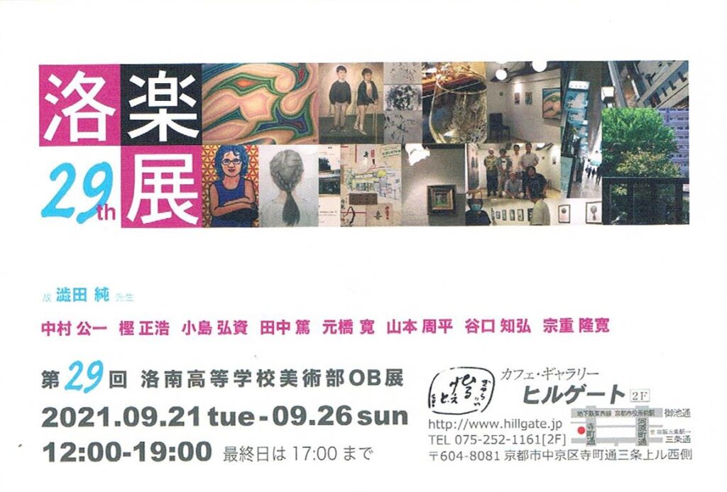 この展覧会は終了しました 絵画 第29回 洛南高等学校美術部OB展 洛楽展 基本情報 会期2021年09月21日(火) 〜 2021年09月26日(日) 会場2階 時間12:00~19:00(最終日~17:00) 〈出展者〉故 澁田 純先生中村 公一 樫 正浩 小島 弘資 田中 篤元橋 寛 山本 周平 谷口 知弘 宗重 隆寛