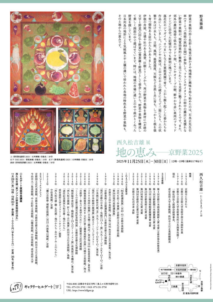 伊根の舟屋、古墳や社のある風景、巨樹シリーズから、再び野菜や果物を素材に《お経の文字と野菜》《印仏と野菜》《曼荼羅と野菜》として想念しながら、野菜や果物を構成して楽しく画面の中で遊ばせています。時には、地域の市場に通い土の中で曲がりくねった野菜を探しています。