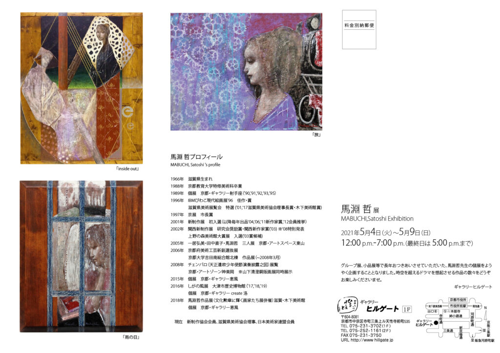 グループ展、小品展等で長年おつきあいさせていただいた、馬淵哲先生の個展をようやく企画することとなりました。時空を超えるドラマを想起させる作品の数々をどうぞお楽しみ下さいませ。