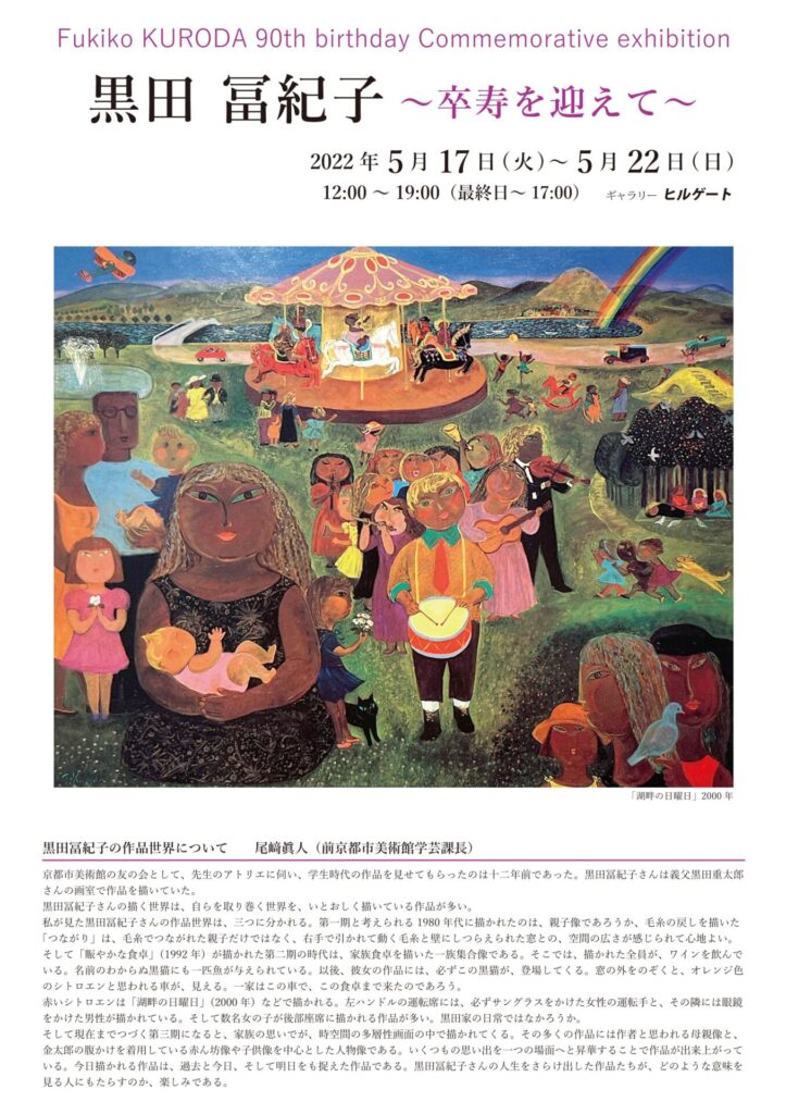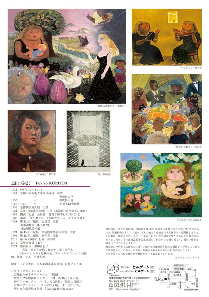 黒田冨紀子先生の個展は、当画廊では2009年以来4度目となります。2012年からは夫、黒田暢先生との二人展や、三人の娘さんを加えた5人展等も4度開催しました。その間に、暢先生が亡くなり、三女の三紀さんが交通事故死なさるなどの御不幸がありましたが、その都度冨紀子先生は涙にくれながらも更に明るく、暖かい作品を描きつづけて下さいました。