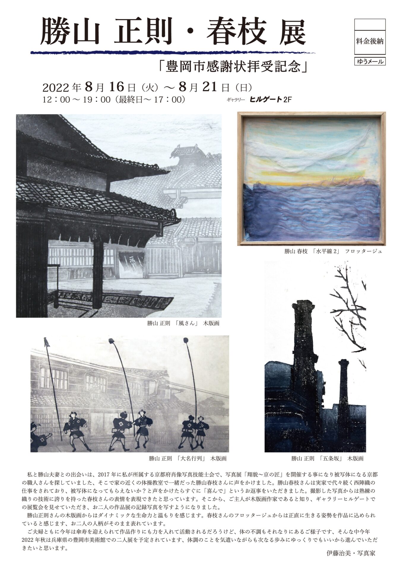 私と勝山夫妻との出会いは、2017年に私が所属する京都府肖像写真技能士会で、写真展「翔貌~京の匠」を開催する事になり被写体になる京都の職人さんを探していました、そこで家の近くの体操教室で一緒だった勝山春枝さんに声をかけました。勝山春枝さんは実家で代々続く西陣織の仕事をされており、被写体になってもらえないか?と声をかけたらすぐに「喜んで」というお返事をいただきました。撮影した写真からは熟練の織りの技術に誇りを持った春枝さんの表情を表現できたと思っています。そこから、ご主人が木版画作家であると知り、ギャラリーヒルゲートでの展覧会を見せていただき、お二人の作品展の記録写真を写すようになりました。